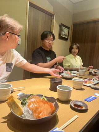 | ママの家族(朝子家)との楽しい時間を過ご させていただいた。短い期間だったが充実した 時であった。我が家の子供にとっては爺ちゃん と婆ちゃんと過ごす時間、爺ちゃんと婆ちゃん にとっては孫と過ごす時間、掛け替えのない時 であった。最後の晩餐は回転しない寿司屋に 繰り出した。とても喜んでいただいてパパも ご満悦である。ママにとっては悲しいお別れ! |